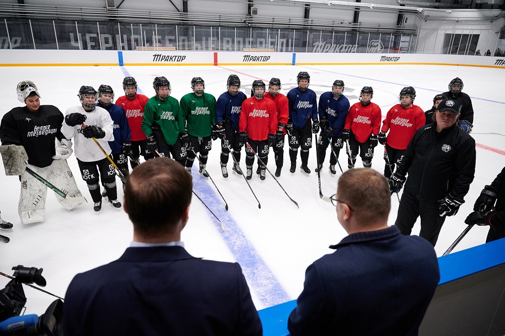 В разгар ледового занятия новую площадку посетило руководство Челябинской области, Континентальной хоккейной лиги и клуба «Трактор». Хоккеистки и руководители пообщались прямо на льду.