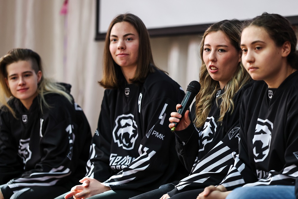 Формат свободного общения со школьниками вскрыл тайны «Белых Медведиц». Например, ведущий защитник команды Надежда Лофиченко получает знания именно в школе №129. Нападающего Алину Нарудинову в хоккей привела нынешний массажист «Белых Медведиц» Екатерина Скородумова, увидев перспективную девочку на обычной коробке во дворе. А капитан Марина Лазарева почувствовала себя в школе будущей учительницей.