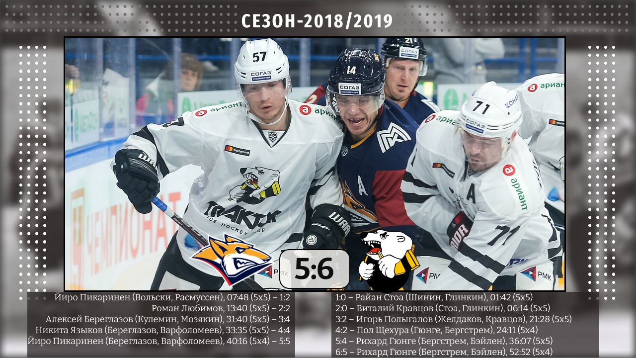 В период межсезонья челябинский «Трактор» потерял главного творца бронзового успеха-2017/2018 Анвара Гатиятулина. Перестраивать приносивший успех оборонительный хоккей на атакующий вызвался Герман Титов. Найти себя в клубе и привить ему новую модель игры тренеру не удалось. Уже спустя месяц он покинул Челябинск. С официальной формулировкой «по семейным обстоятельствам».Впрочем, один яркий матч «Трактор» при Титове все-таки выдал. И произошло это как раз в Магнитогорске в принципиальном южноуральском дерби. Матч получился сверхрезультативным. По ходу игры хозяевам приходилось постоянно отыгрываться. И все же последнее слово осталось за «Трактором», а автором победной шайбы стал швед Рихард Гюнге.