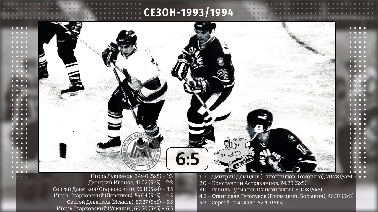 Не прошло и полгода после памятного противостояния в серии плей-офф сезона-1992/93, как южноуральские команды выдали еще один матч-шедевр. В этот раз чемпионат МХЛ прошел по иной формуле — простой и незамысловатой: победители и призеры турнира определялись по итогам «гладкого» чемпионата. Другими словами, каждая из 24 команд сыграла против соперников дома и в гостях, а сама таблица первенства была общей, без разделения на конференции/дивизионы/группа. Отдельно, правда, проводился еще и Кубок МХЛ с привычной серией плей-офф. Его победитель получал как бы приятный бонус в виде трофея по окончании сезона, однако звание чемпиона России, как уже говорилось выше, определялось по итогам регулярного чемпионата.